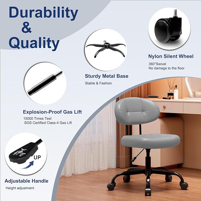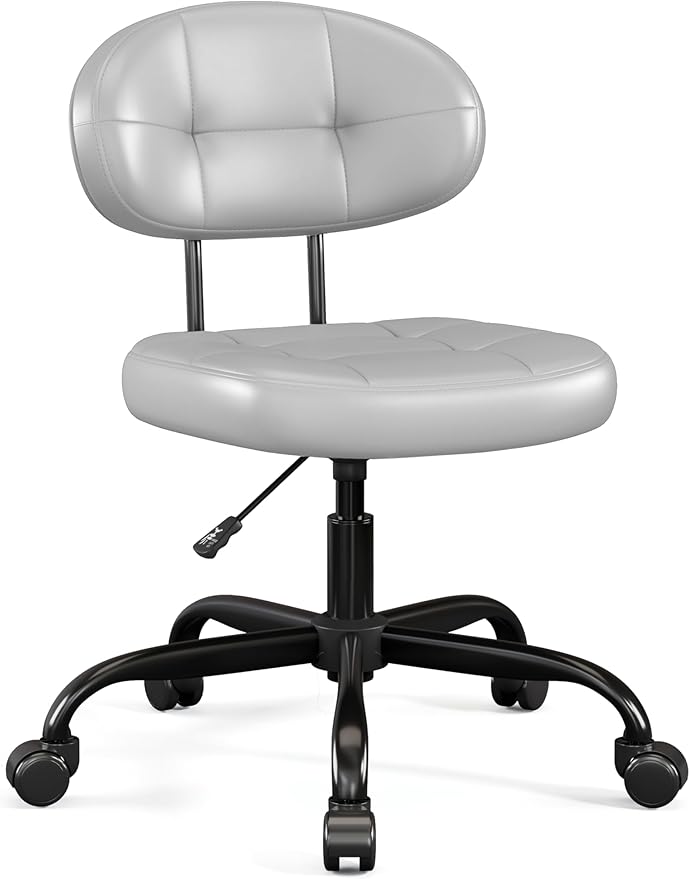 Misolant Vanity Chair with Back, Small Armless Cute Office Chair with Wheels and Lumbar Support, Comfy PU Leather Desk Computer Chairs with Adjustable Height, 360°Swivel for Home Bedroom Office, Gray