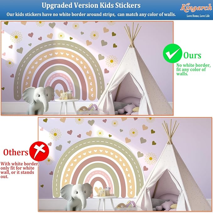 - [Upgraded Version Kids Stickers]: Our nursery decor has no white or transparent border around the different color strips,which can match any color of walls. The others' have white between the rainbow colors, only fit for white surface.