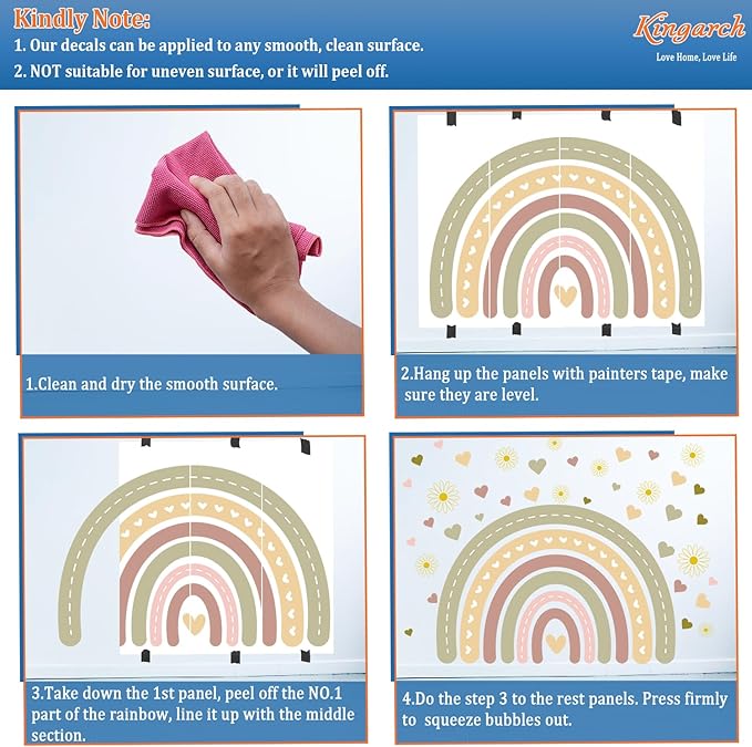 - [Easy To Apply Wall Mural]: Easily unpeel and re-peel if you mess up the alignment. 1. Clean and dry the smooth surface. 2. Hang up the panels with painters tape, make sure they are level. 3. Take down the 1st panel, peel off the NO.1 part of the rainbow, line it up with the 2nd section. 4. Do the step 3 to the rest panels. Press firmly to squeeze bubbles out.