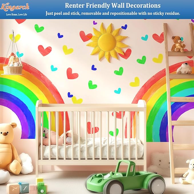 Large Watercolor Rainbow Wall Decals, Hearts Peel and Stick Fabric Nursery Wall Decor, Removable Home Room Wall Decor Murals Stickers for Kids Girls Toddler Bedroom Living Room Playroom