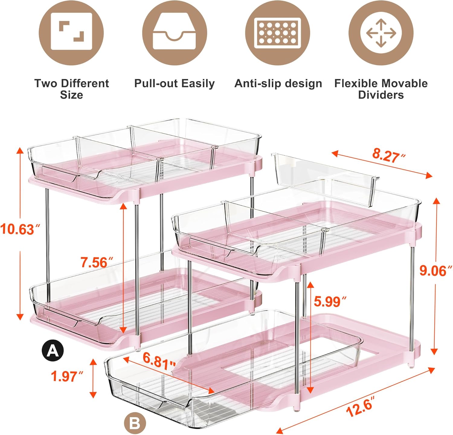 Delamu 2 Sets of 2-Tier Multi-Purpose Bathroom Under Sink Organizers and Storage, Stackable Kitchen Pantry Organization, Pull Out Medicine Cabinet Organizer with 8 Movable Dividers, Pink