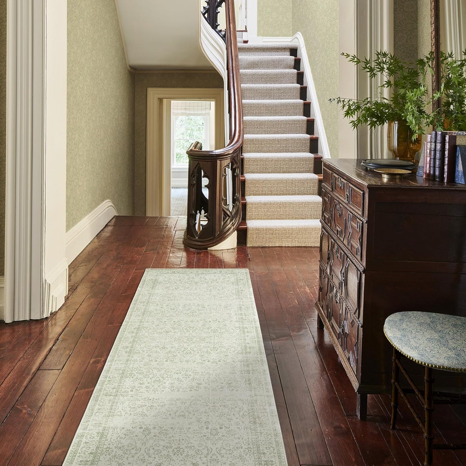 Sage Green Washable Bathroom Hallway Runner Rug Non Slip Vintage Boho Floral Long Runners Rugs for Entryway Indoor Laundry Room Bath Floor Kitchen,2x6