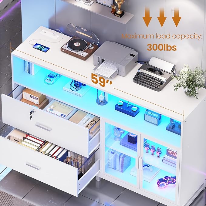 - 📁【What Can You Get?】 The file cabinet has 2 file drawers with 1 lock for Legal, Letter, A4 sizes standard file, power strip for charging 4 devices at the same time, spacious desktop(59"L) large enough for printers and scanners, 4 storage shelves, a pair of acrylic cabinet door for protecte documents and LED light. Filing cabinet that can be combined with any computer desk to form an L-shaped office area.