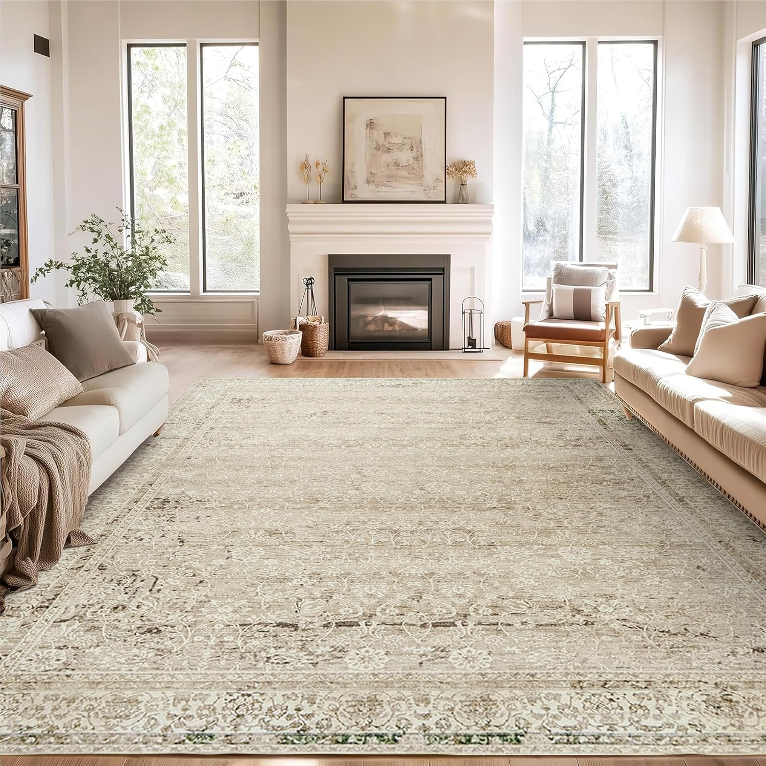 Cream and Light Tan Area Rugs Washable Rug for Living Room Bedroom, Faux Wool Soft No Slip Floral Boho Vintage Extra Large Carpet for Dining Room 9x12