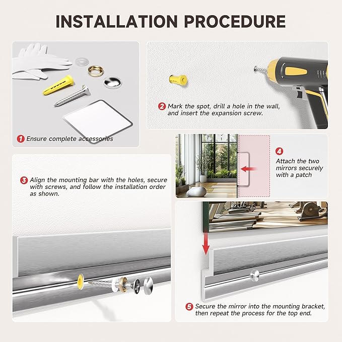 - EASY TO INSTALL: Simply follow the instructions and complete the installation step by step. Home fitness mirrors are suitable for most wall surfaces such as tile, brick, wood and painted walls