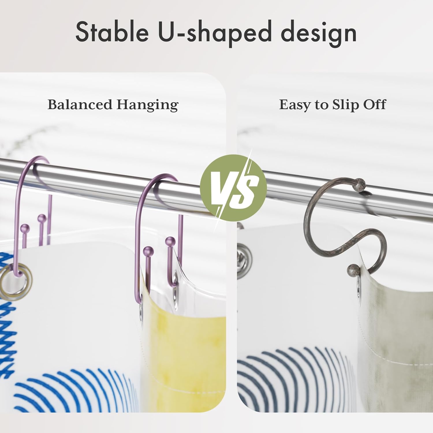 - Unique design: These shower curtain hooks feature a unique double-hook design, allowing you to hang both the curtain and liner simultaneously. The inward-bending hooks provide extra security, preventing the curtain from sliding off
