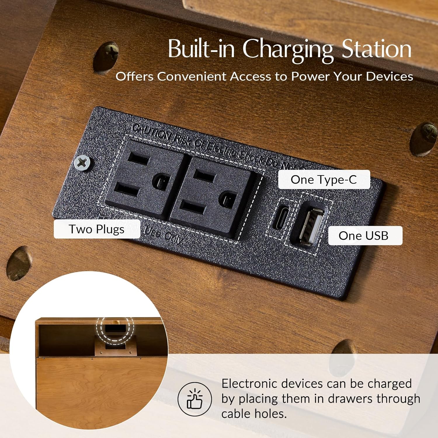 - Built-in Charging Station: Equipped with USB and Type-C ports, the conveniently located charging station keeps your devices powered and within reach, eliminating the need for extra cords or adapters.