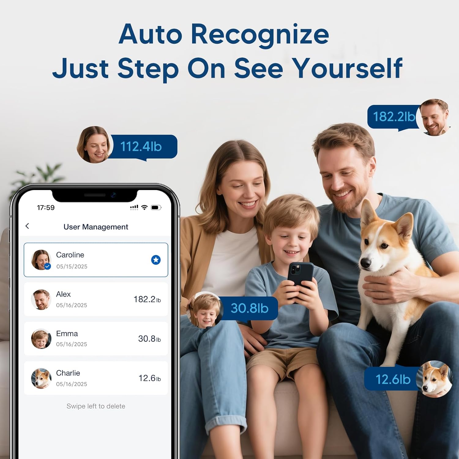 - Smart Weight Tracking & Trends: Track your progress effortlessly with automatic daily weight comparisons. Our scale records your each day last weigh-in and shows precise changes (+/- lbs) alongside personalized goals. The clear LED display presents weight, BMI, and body fat percentage at a glance, while trend lines reveal your journey over time - only needs one-time app setup for basic tracking