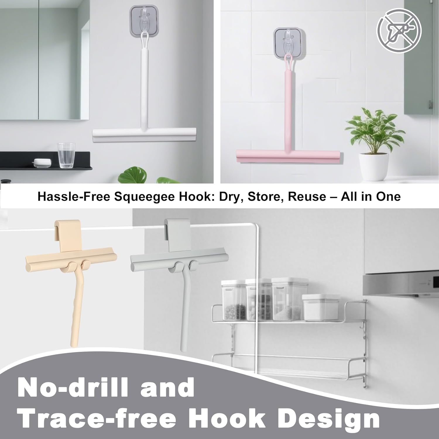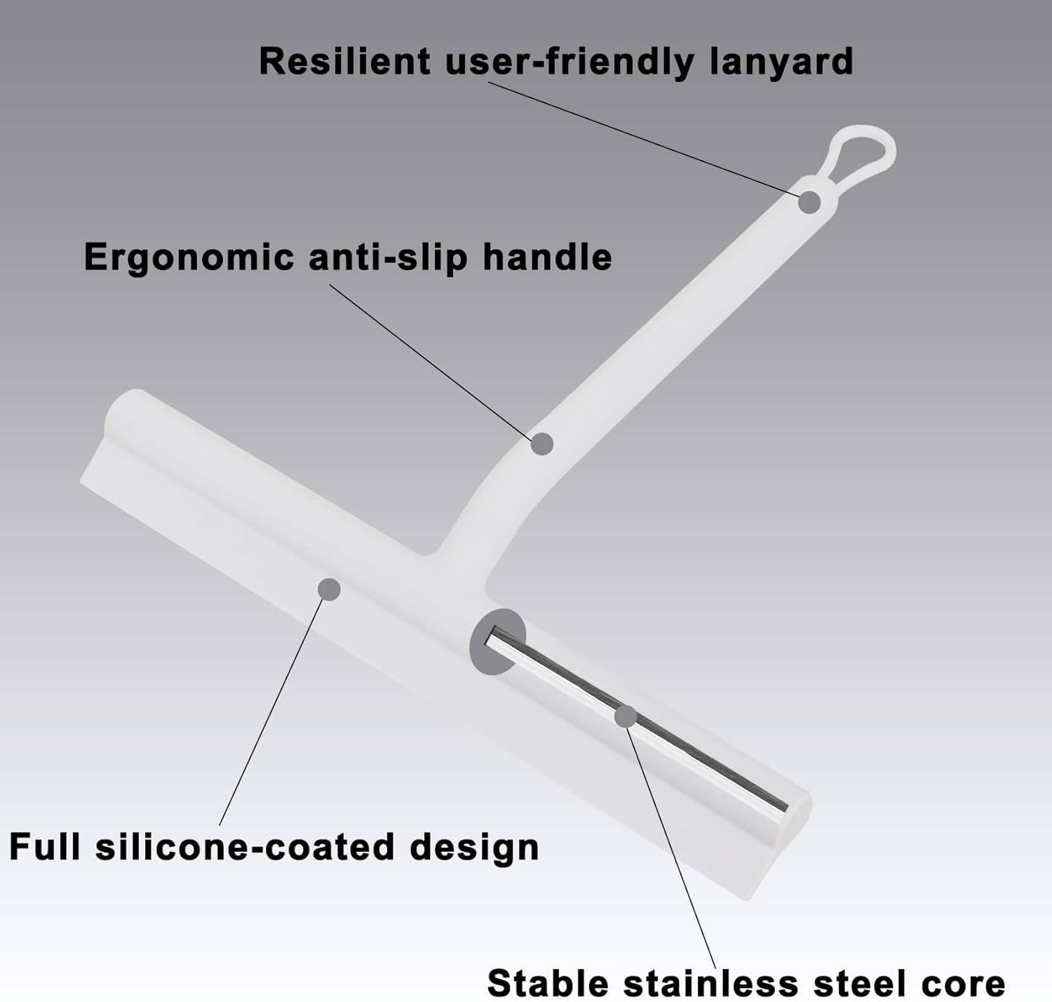 Squeegee for Shower Glass Doors, Resilient Loop - No-Drill & Adhesive Hook, Silicone Shower Squeegee with Stainless Steel Core, Cleaning Tool for Home, Kitchen, Bathroom & Car - White