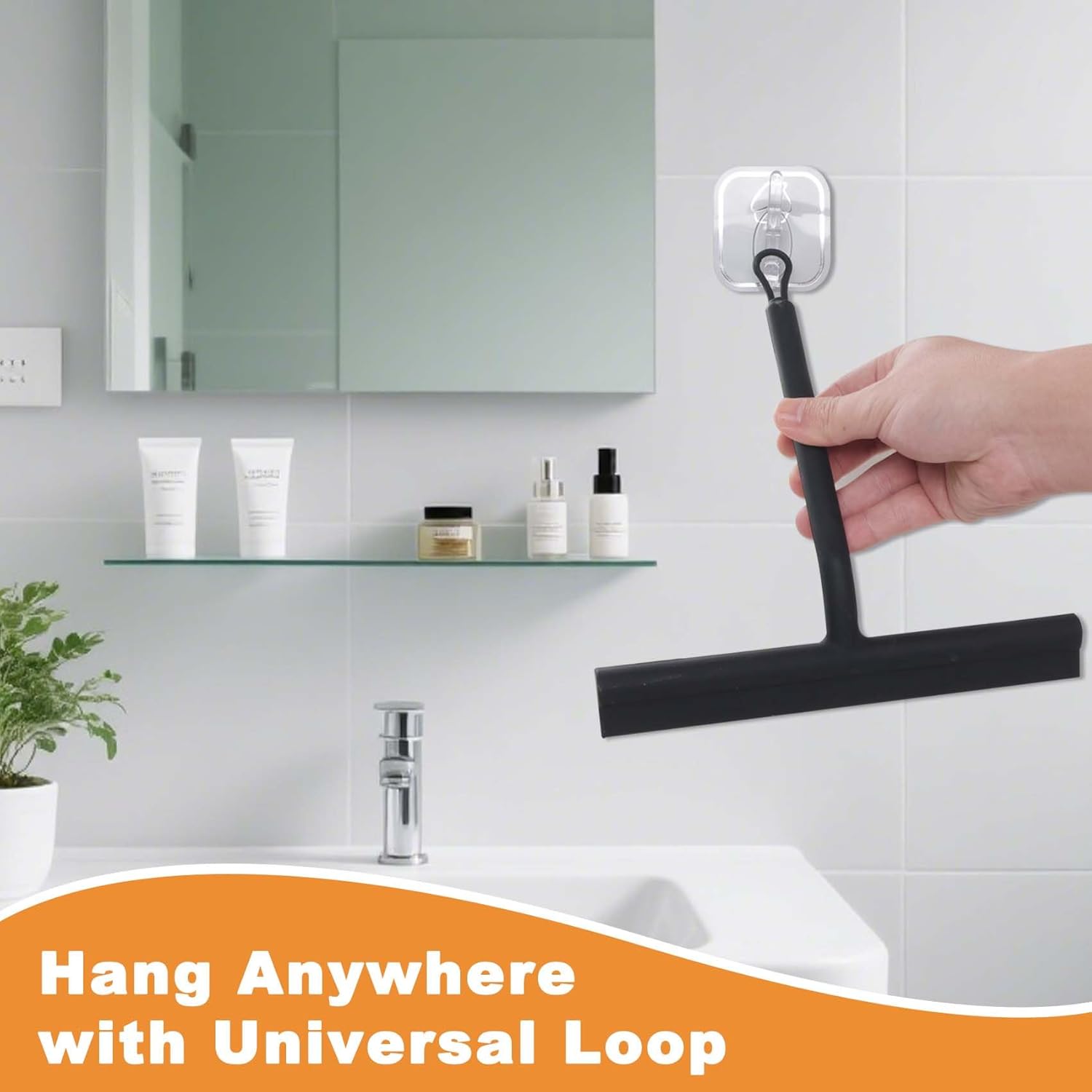Squeegee for Shower Glass Doors, Resilient Loop - No-Drill & Adhesive Hook, Silicone Shower Squeegee with Stainless Steel Core, Cleaning Tool for Home, Kitchen, Bathroom & Car - Black
