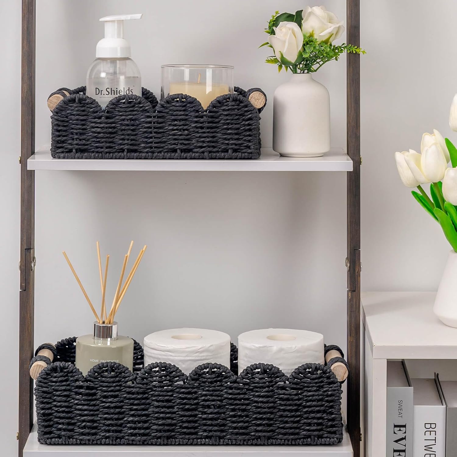CubesLand Toilet Paper Storage Basket Scalloped Edge Home Decor Basket, Living Room Cozy Decor, Paper Rope Small Baskets for Over Toilet Storage Shelf, End Table, Shelves, with 2 Wooden Handles, Black