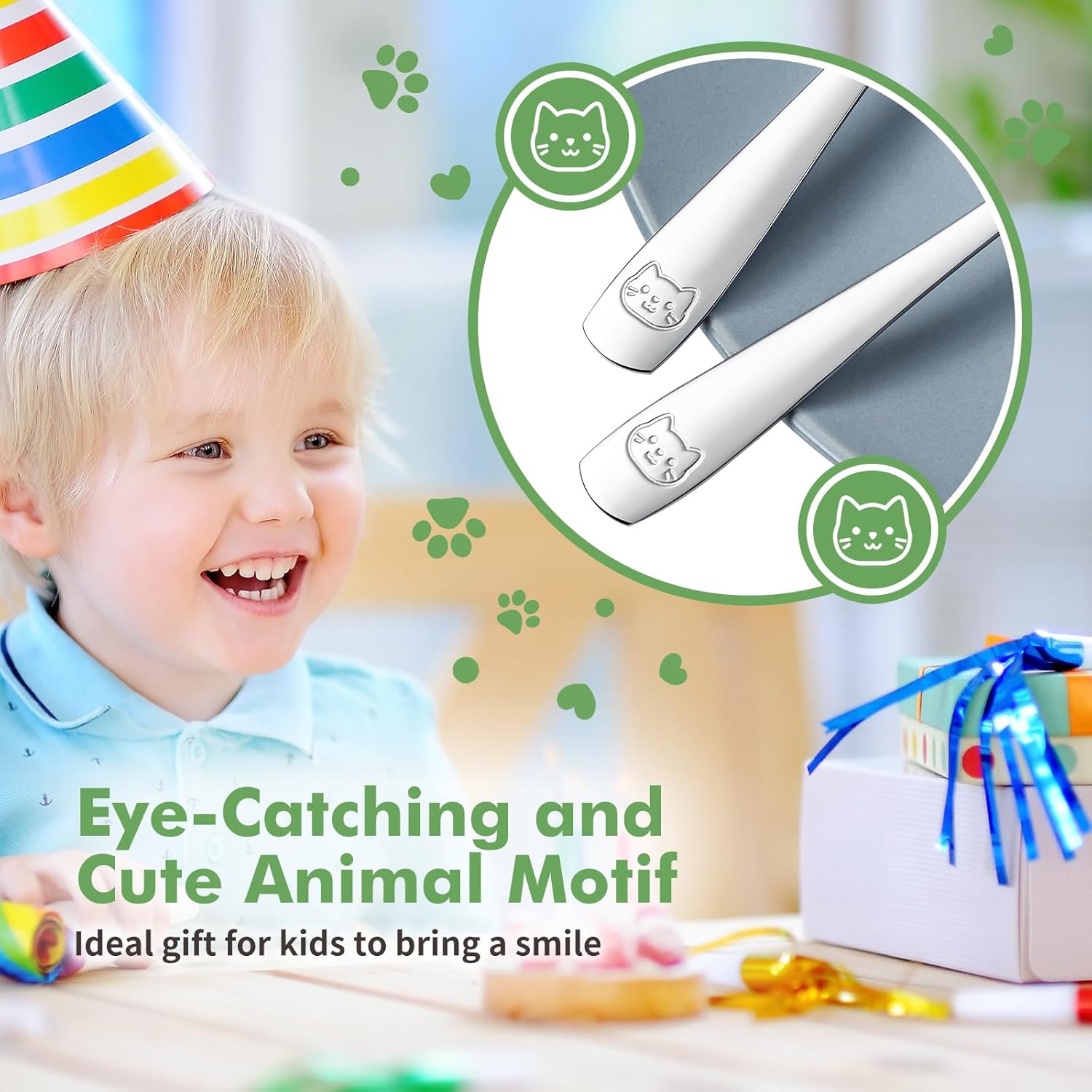 - ENGAGING MEALTIMES: Our kids silverware set embossed with a mirror-polished finish and adorable animal motifs.Your child will be excited to dine with a kitten on the spoon, turning mealtime into a fun and engaging experience