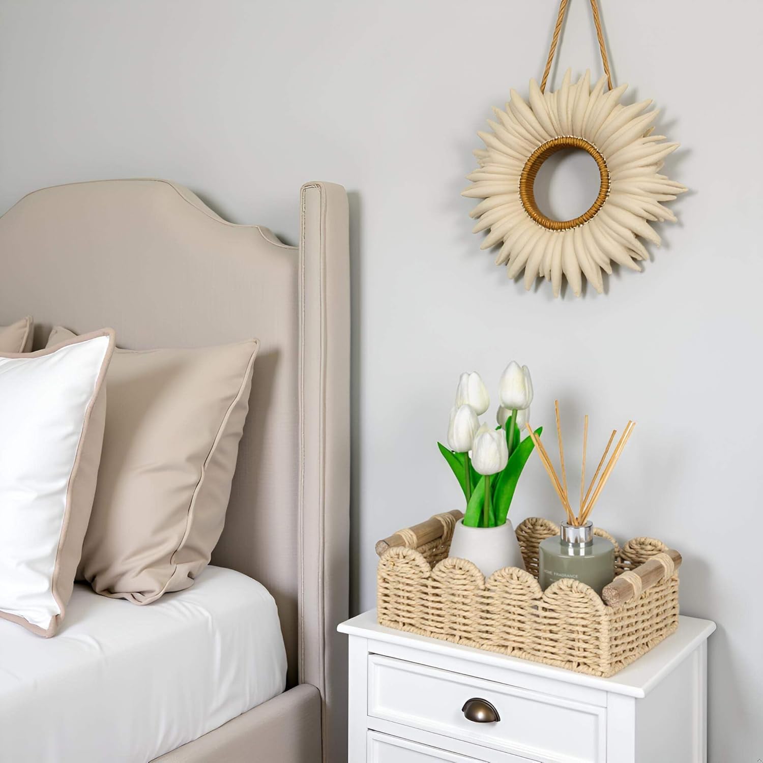 - MULTIPURPOSE USE: Our scalloped edge paper rope decor basket add personality and charming addition to bedroom, living room, bathroom, nursery and space-floating shelves, over toilet storage shelf, end table, nightstand,storage cabinet, bookcase and more, also serve well to small items, beauty products, cleaning supplies, and more