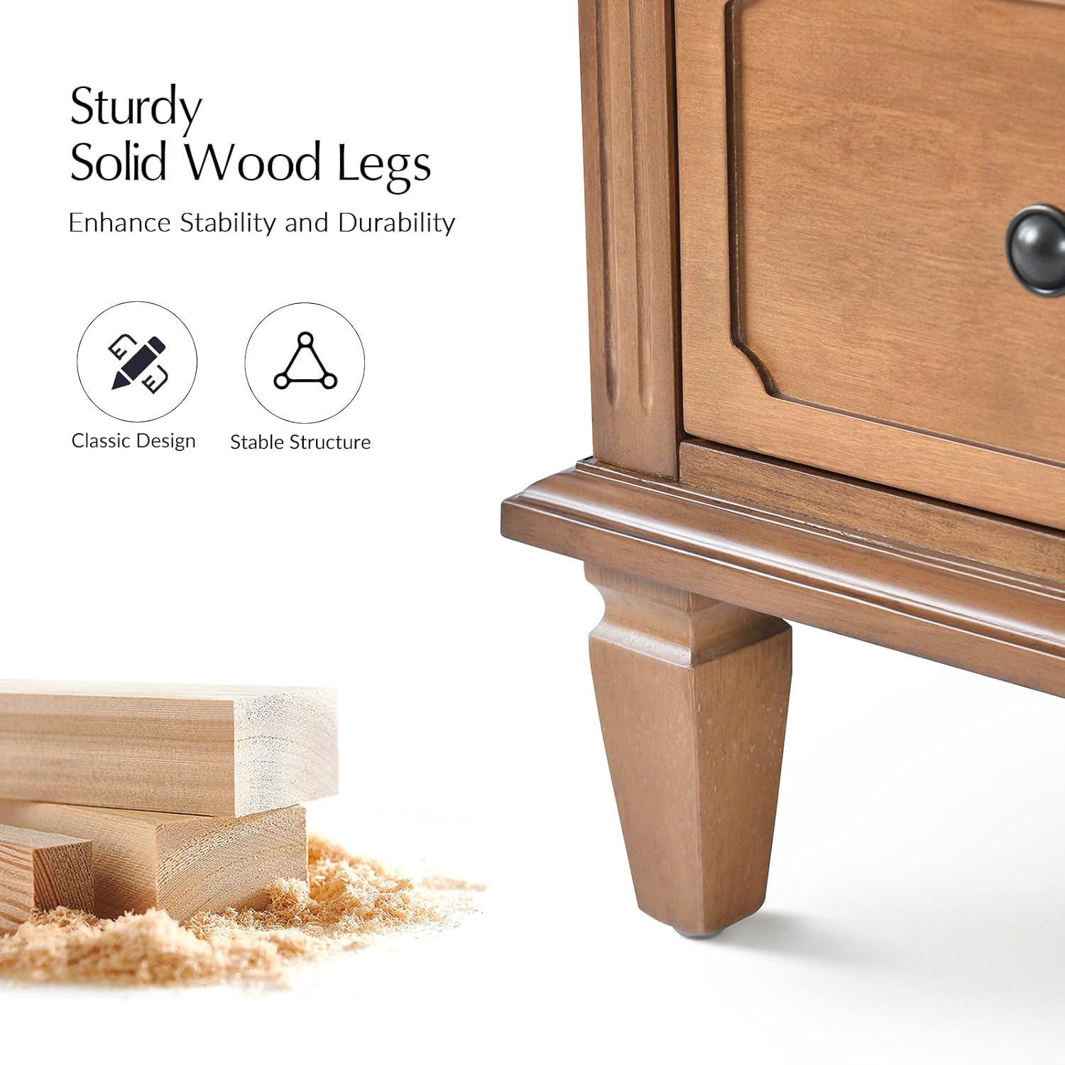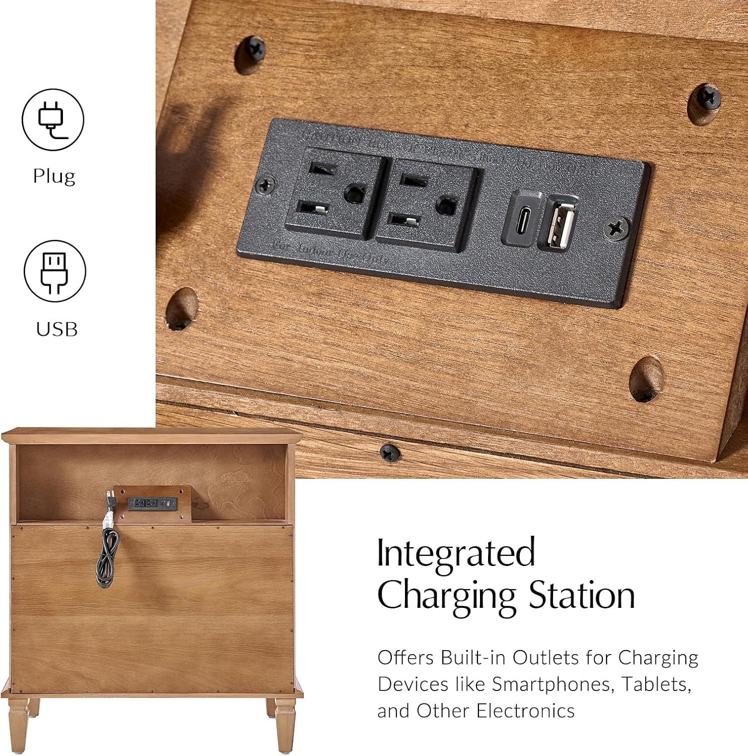 HULALA HOME Mid-Century Modern Nightstand with Charging Station and Divider Tray, 4-Drawer Bedside Table with Solid Wood Legs (Acorn)