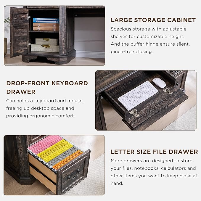 T4TREAM 59" Farmhouse Executive Desk with Hutch,Wood Home Office Computer Desk, Featuring Keyboard Tray,Charging Station,File Drawer, Storage Cabinet,for Work and Study (Dark Rustic Oak)