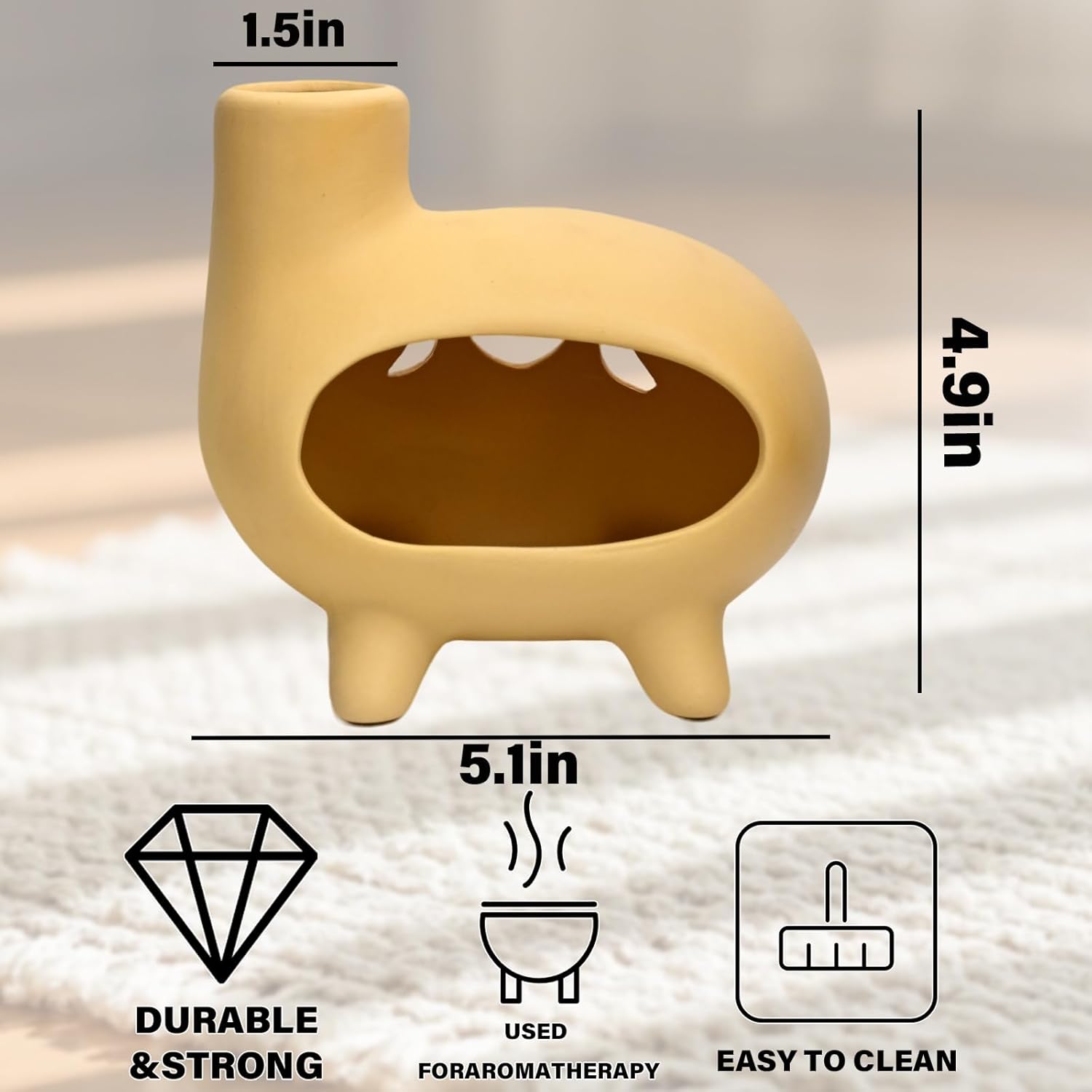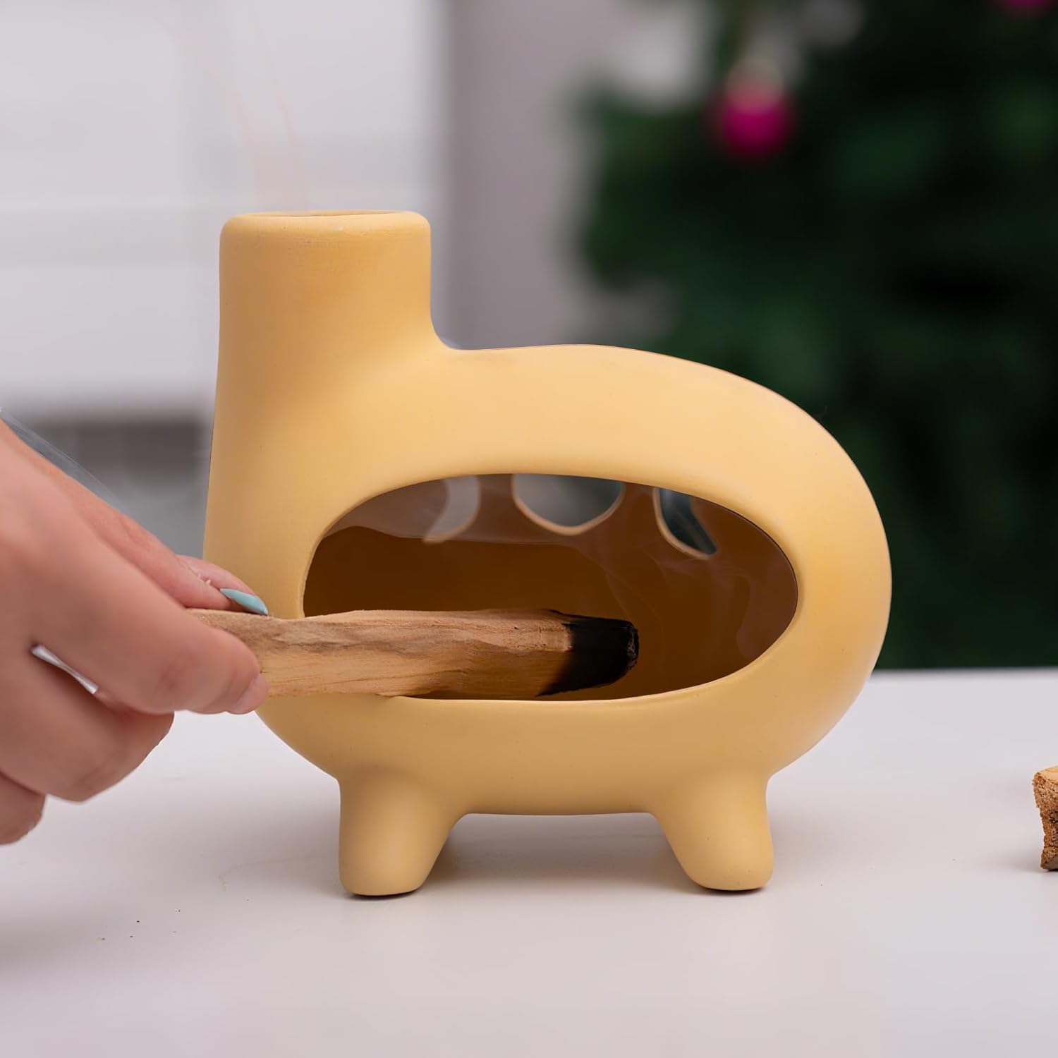 Elegant Handcrafted Ceramic Palo Santo Burner-Yellow Terracotta Footed Incense Holder for Meditation,Compatible with Wood Sticks,Sage,Ash&Cones-Mini Aromatic Home Altar with Chimney Design
