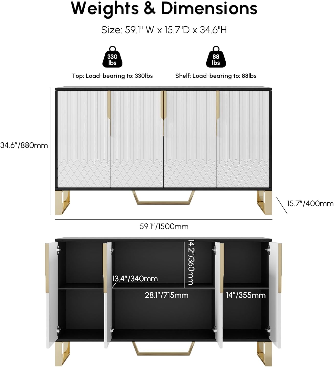 homary 59" Buffet Sideboard Cabinet with Storage – Modern Kitchen Server Table with 4 Doors & Adjustable Shelves, Stainless Steel Frame for Dining Room, Living Room, Entryway