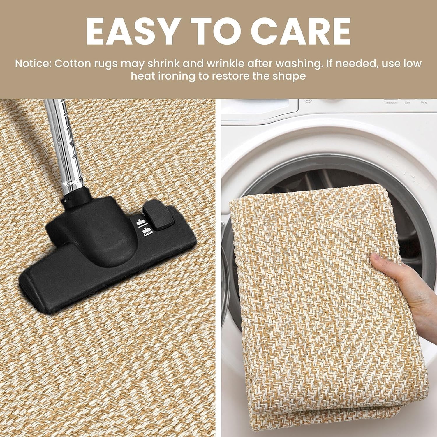 - Machine Washable: Crafted from premium cotton-linen blend, this rug is soft to the touch and machine washable. Light creases from folding or washing can be easily removed by low-temperature tumble drying or ironing. Note: Slight shrinkage after washing is normal