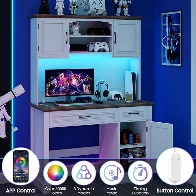 Farmhouse 47" Executive Desk with Hutch, 2 Drawers and LED Light, Computer Desk with Storage Cabinet and Charging Station,Workstation for Home Office and Study.Unique White