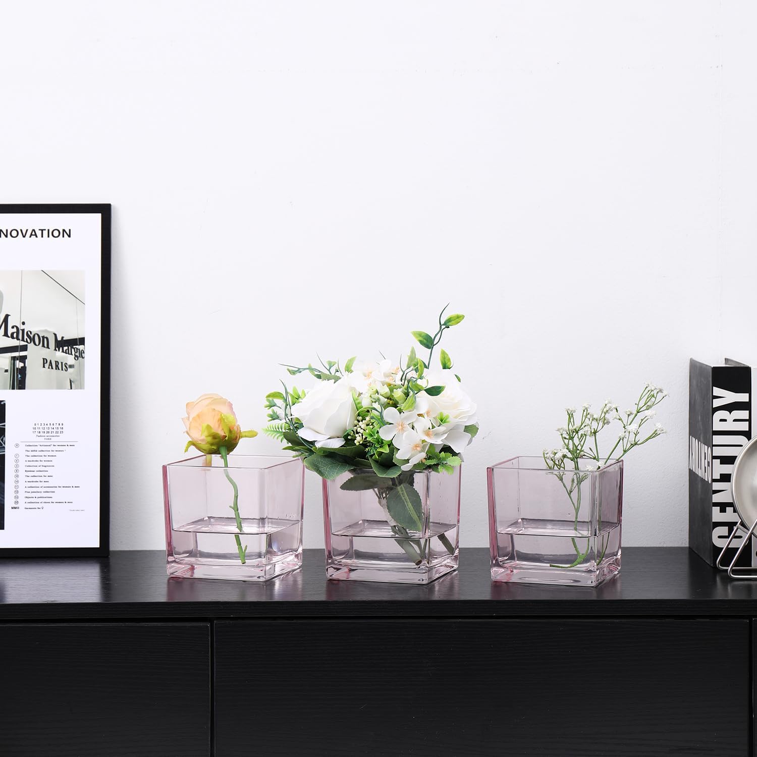 Square Pink Glass Vases Set of 2, 6" x 6" x 6" Square Vase for Centerpieces, Flower Vases for Centerpieces, Small Vase for Wedding, Party, Home Office Decoration