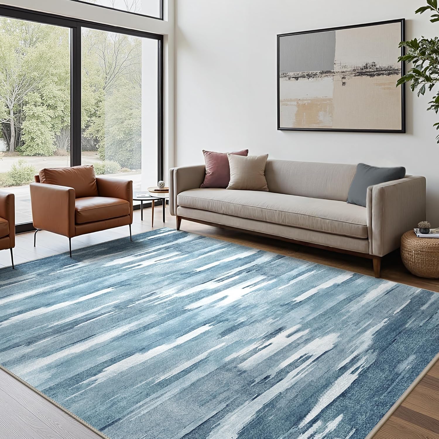 Area Rugs 8x10 Machine Washable Rug for Bedroom Living Room Dining Room, Large Modern Abstract Soft Rugs, Indoor Low Pile Carpet with Non Slip Rubber Backing, Glacial Blue