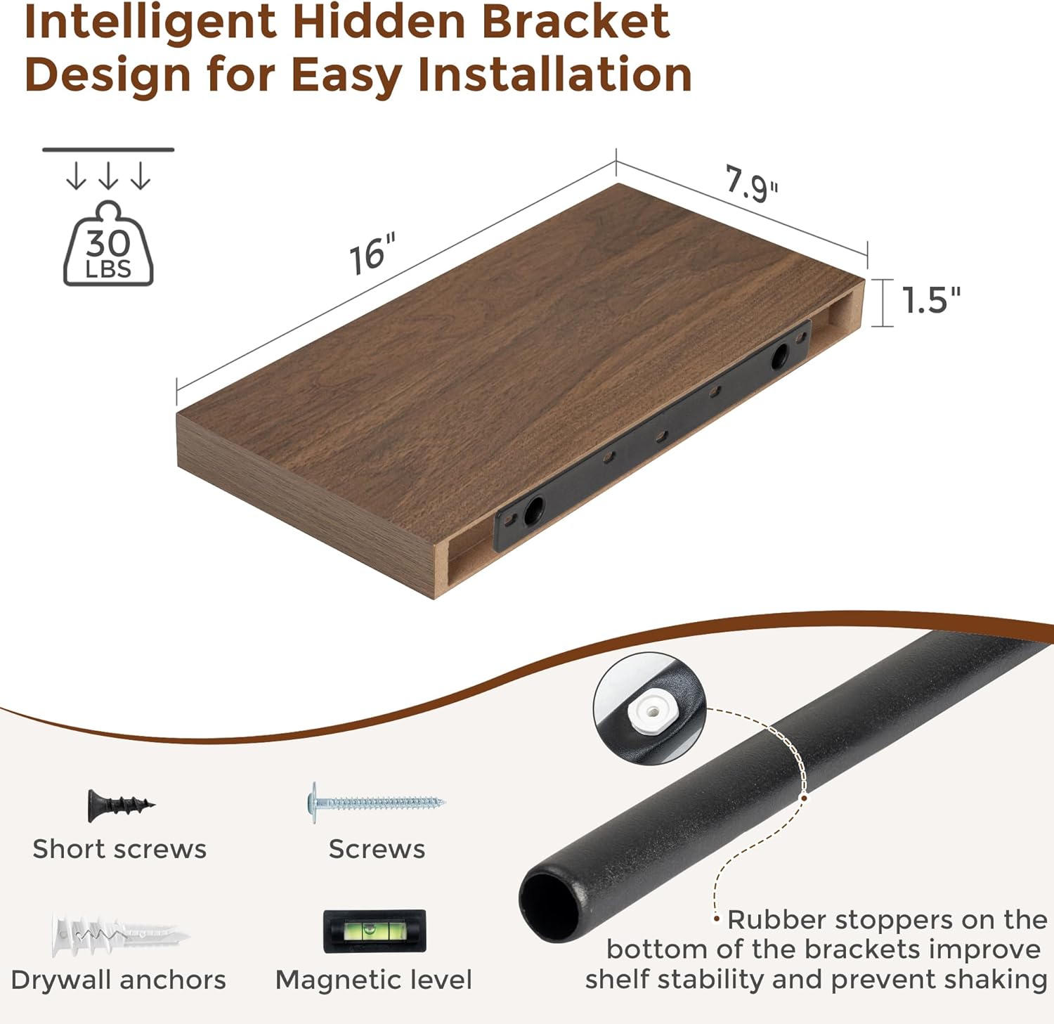 - ăEasy To InstallăThis walnut floating shelves not only come with stainless-steel galvanized invisible brackets, but also equipped a fixing screw at the bottom to fix the shelf on the support rod, which solves the problem of sliding and is not easy to damage, and can be used for a long time. Instructions, magnetic level, drywall anchors, and screws included.