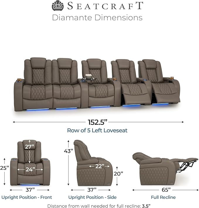 Seatcraft Diamante Zero-Gravity CoolZero Italian Leather Home Theater Seating, Power Headrest, Power Recline, Row of 5 Left Loveseat, Gray