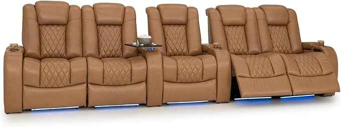 Seatcraft Diamante Zero-Gravity CoolZero Italian Leather Home Theater Seating, Power Headrest, Power Recline, Row of 5 Dual Loveseats, Tan Oak