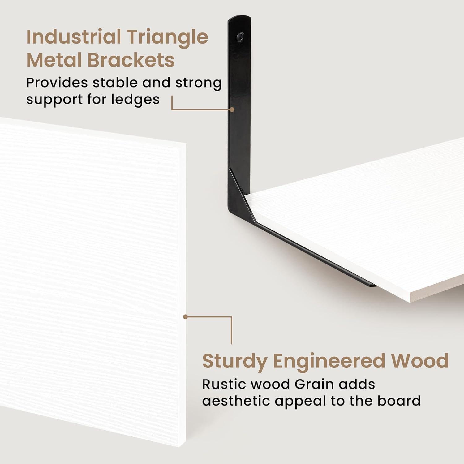 - ăStrong & Durable Construction for Long-Lasting UseăConstructed from high-quality, smooth-finished MDF, these wall shelves provide a sturdy and attractive foundation that resists warping and scratching over time. The robust black L-shaped metal brackets are designed from industrial-grade steel, ensuring excellent support and stability. Each shelf can bear up to 50 lbs when properly installed, allowing you to confidently store heavier items like books, cookware, or collectibles without worry.