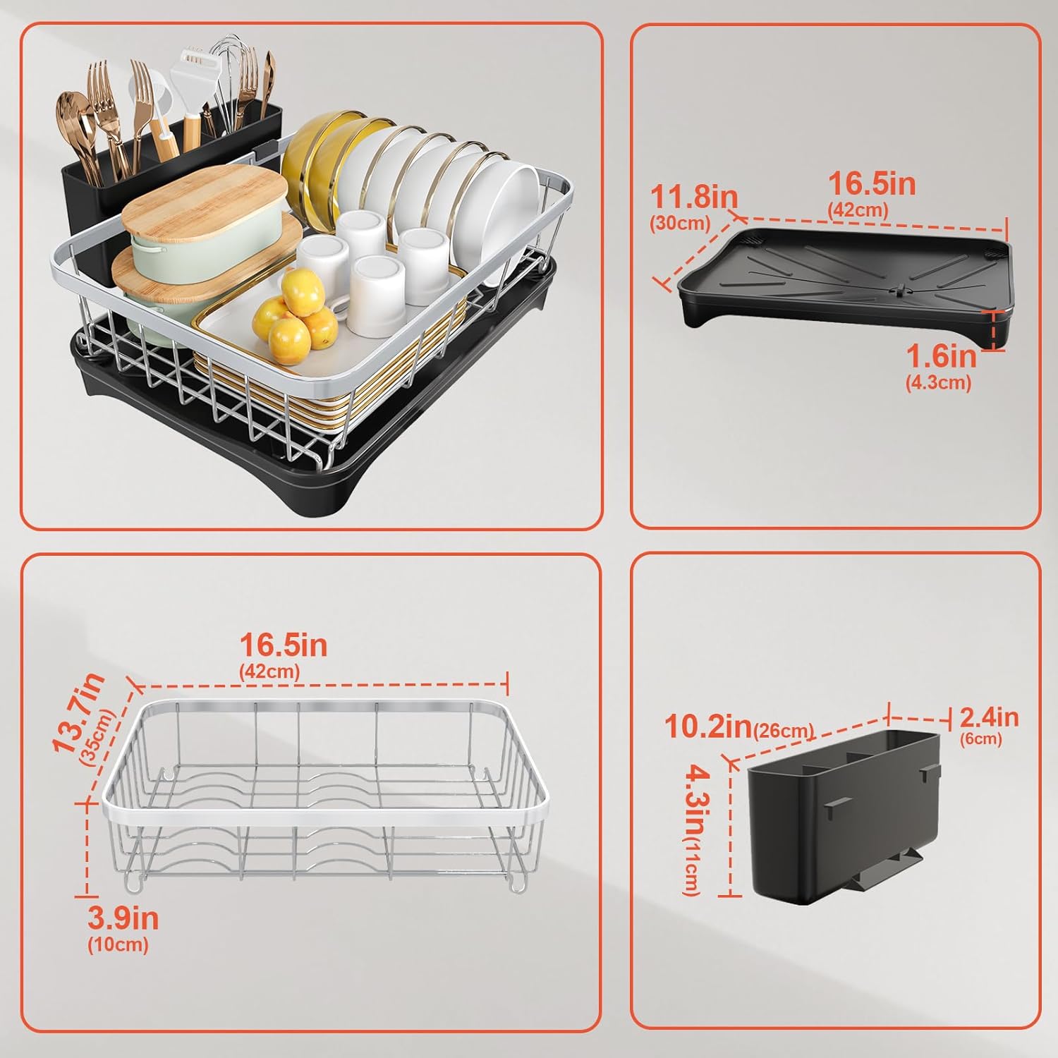 Dish Drying Rack - 304 Stainless Steel Dish Rack for Kitchen Counter with Utensil Holder & Cutlery Tray, Space Saving Countertop Organizer, Black