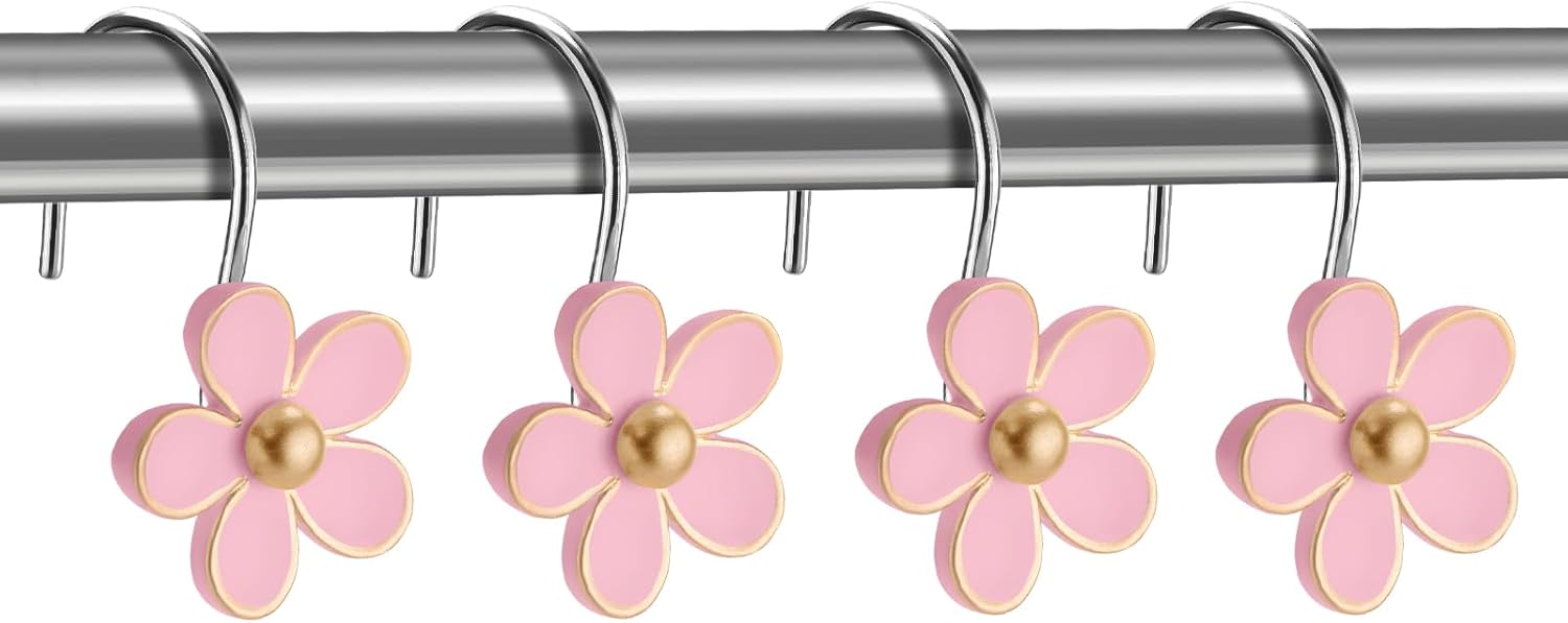 Cute Flower Shower Curtain Hooks, Pretty Floral Themed Elegant Bathroom Decor, Gold/Pink