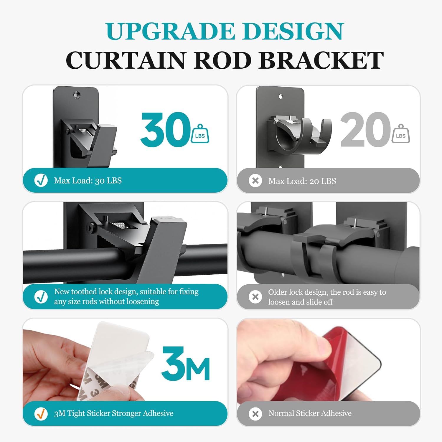 Adhesive No Drill Curtain Rod Brackets - Heavy Duty 30LB Holders for Bathroom Bedroom Kitchen, Universal Damage-Free Window Rod Hooks with Nail-Free Installation (2PC Black)