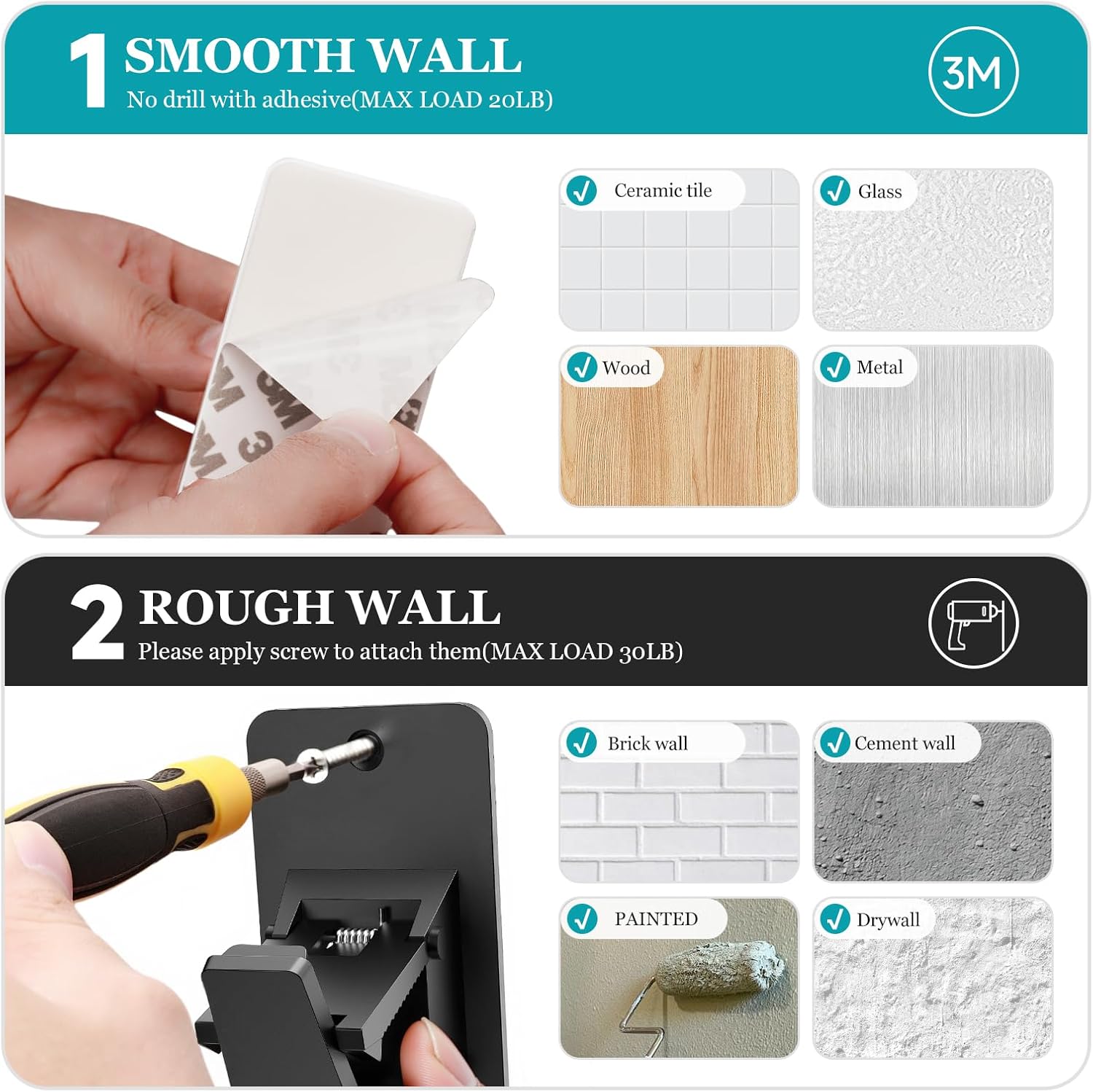 - ăDual Installation Curtain Rod HolderăEngineered with 3M adhesive for no-drill installation on tile/metal/glass (20LB), includes screw holes for drywall/concrete walls (30LB). Universal brackets adapt to all wall types while protecting surfaces.