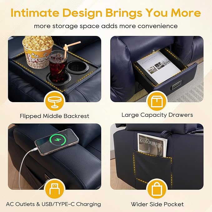 - UNIQUE AND MULTIFUNCTIONAL DESIGN: The design of this modern electric recliner loveseat takes into account versatility. Equipped with two intelligent control panels, it can easily adjust the tilt angle and LED lights. It is also equipped with 4 convenient USB ports and a power outlets. 4 cup holders and storage space. Compared to the unique feature, our sofa has built-in Bluetooth speakers to create an immersive stereo experience