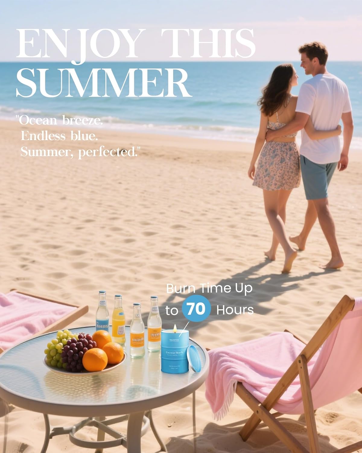 - ⭐Ocean Scented Candle – A Refreshing Escape for Every Season.a perfectly balanced blend of crisp saltwater, fresh coastal air, and subtle hints of cirtus/ coconut/ vanilla/ sage/ tropical fruit. This invigorating fragrance evokes the calming rhythm of waves, making it an ideal year-round favorite—not overpowering, but wonderfully soothing—breathe in the ocean, wherever you are!