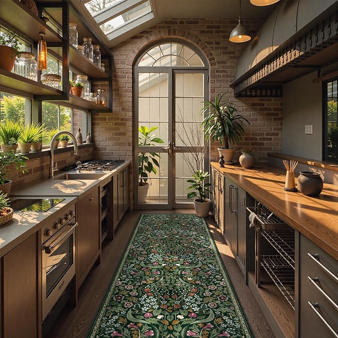 Lahome Floral Kitchen Runner Rug, 2.6x8 Green Non Slip Hallway Runner Rug, Soft Thin Stain Resistant Long Carpet for Laundry, Washable Boho Carpets for Bathroom Entryway