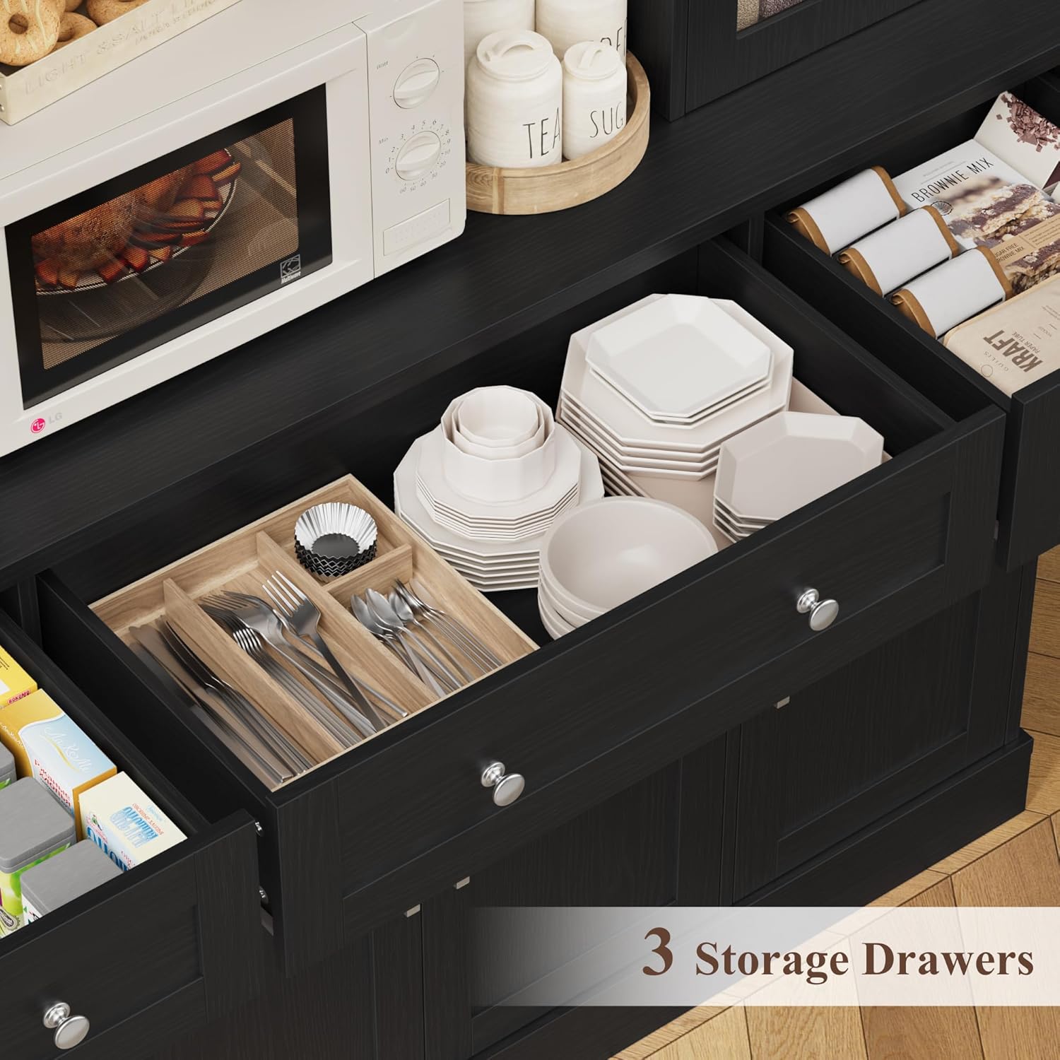 Keyluv 74.8" H Tall Pantry Cabinet with Microwave Stand and 3 Drawers, Large Kitchen Hutch Storage Cabinet with Glass Door and Adjustable Shelves for Kitchen, Dining Room, Living Room, Black