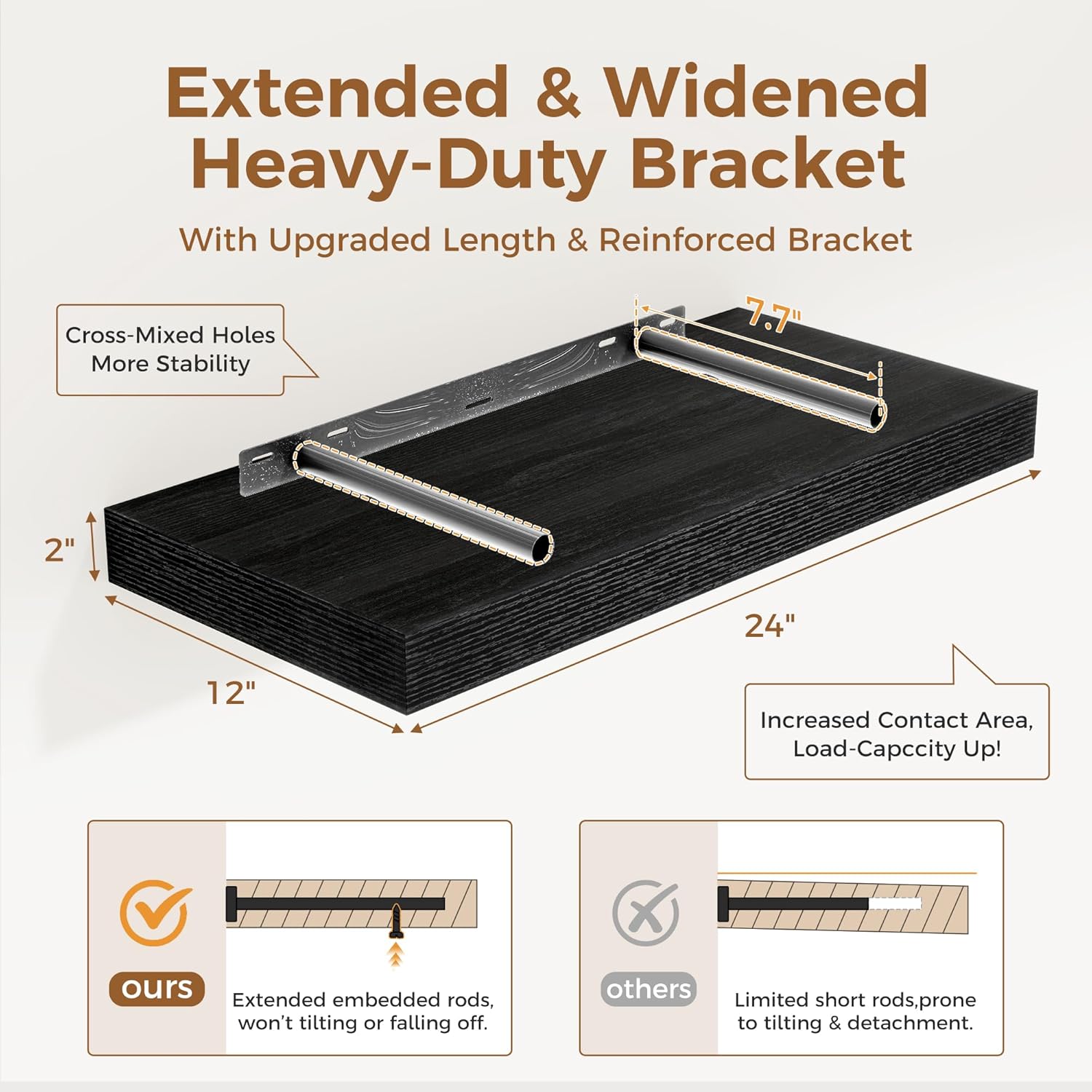 12 Inch Deep Black Floating Shelves, 24 x 12 Floating Shelf for Books, Rustic Wood Deep Wall Shelves for Home Storage & Display, 2" Thicked Shelves for Kitchen, Living Room, Bedroom, 1 Pack
