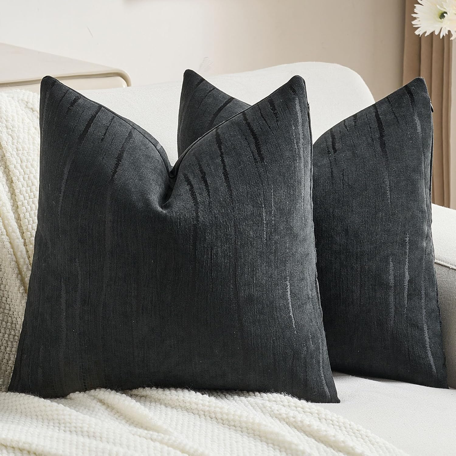 FUTEI Black Chenille Decorative Throw Pillow Covers 16x16 Inch Set of 2,Soft Embossed Striped Textured Cushion Case,Modern Home Decor for Couch Bed Living Room
