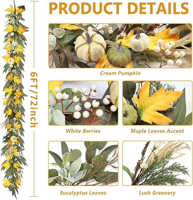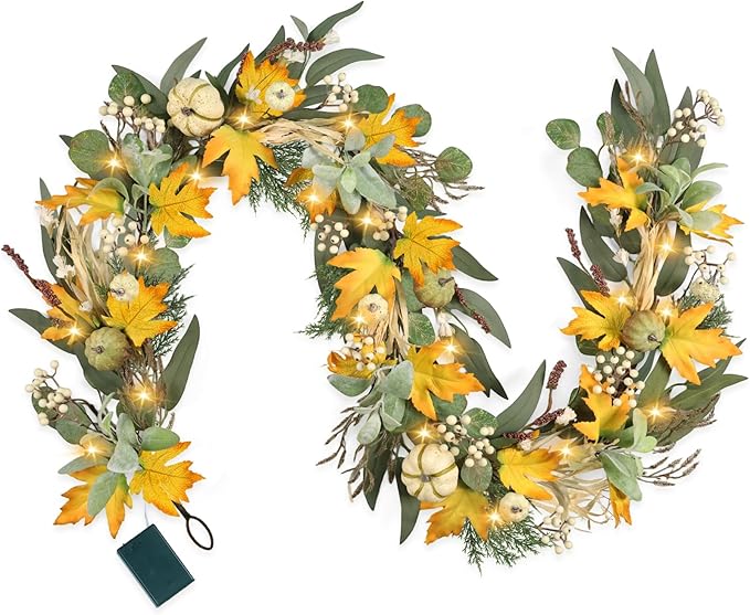 - 【Lifelike Fall Garland with lights】Bring autumn charm into your home with this 6FT fall leaves garland, featuring vibrant maple leaves in rich shades of yellow and green. Adorned with charm pumpkins, white berry clusters, and lush greenery and maple leaves, each element mimics real fall foliage for a natural look. Built-in warm LED lights add cozy glow, creating a festive ambiance both day and night