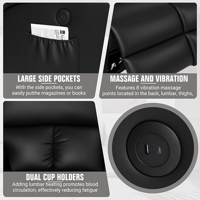 - Massage and Heating: This leather loveseat has features 8 vibration massage points located in the back, lumbar, thighs, and legs, which can be controlled via remote for customized intensity to meet your unique massage needs. Rocking chair adding lumbar heating promotes blood circulation, effectively reducing fatigue and stress and enhancing your overall relaxation experience. Heat works with massage making it perfect for unwinding after a long day.