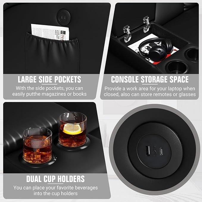 - Comfortable & versatile: The loveseat has UBS on the side and a coffee table in the middle to hold your glasses as well as reading magazines and more. Two side pockets make it more convenient for you to store your phone or other small items. At the same time, there are cup holders for convenient storage of drinks or cups. The thick headrests, backrests and armrests are upholstered in soft PU leather, making them easier to maintain and not dirty