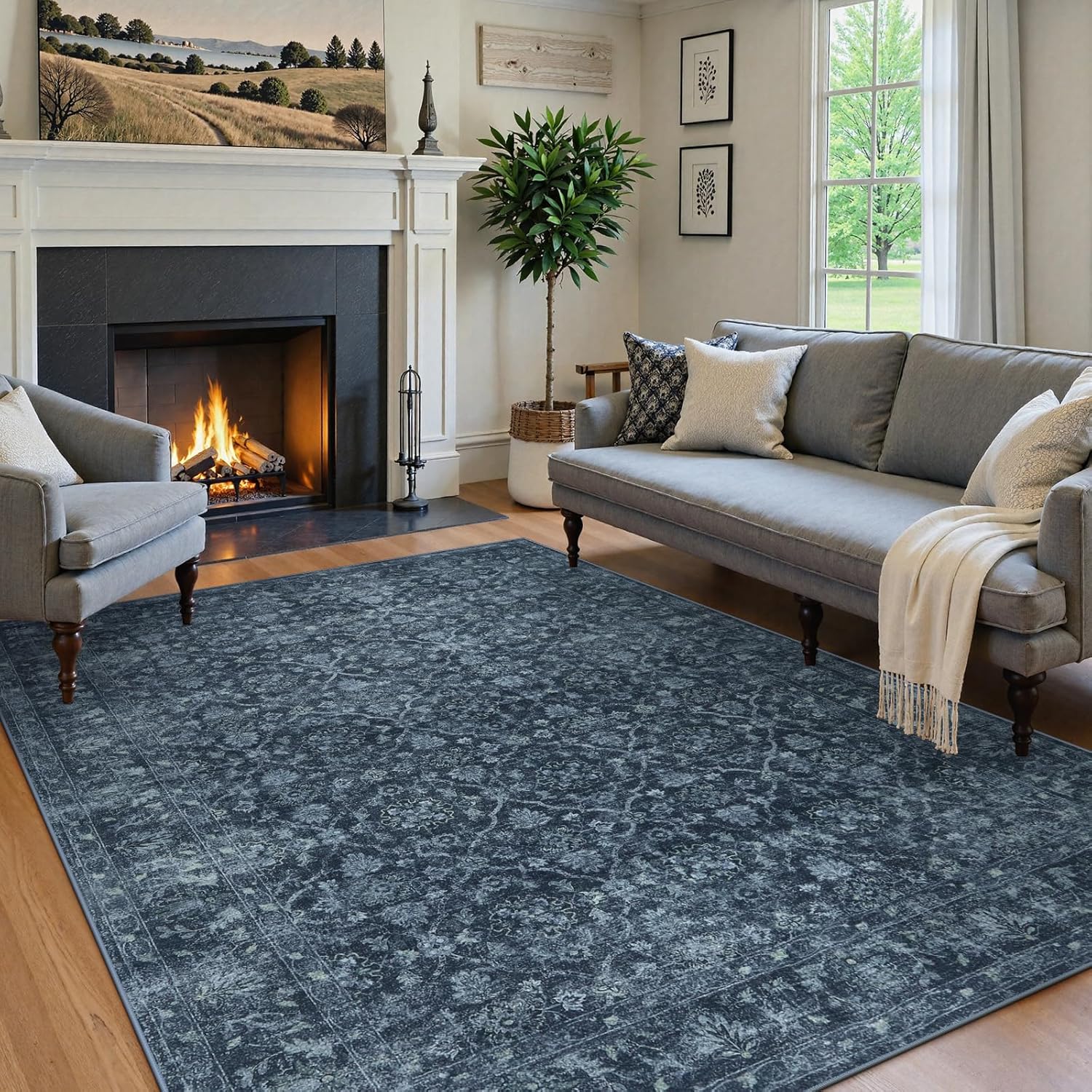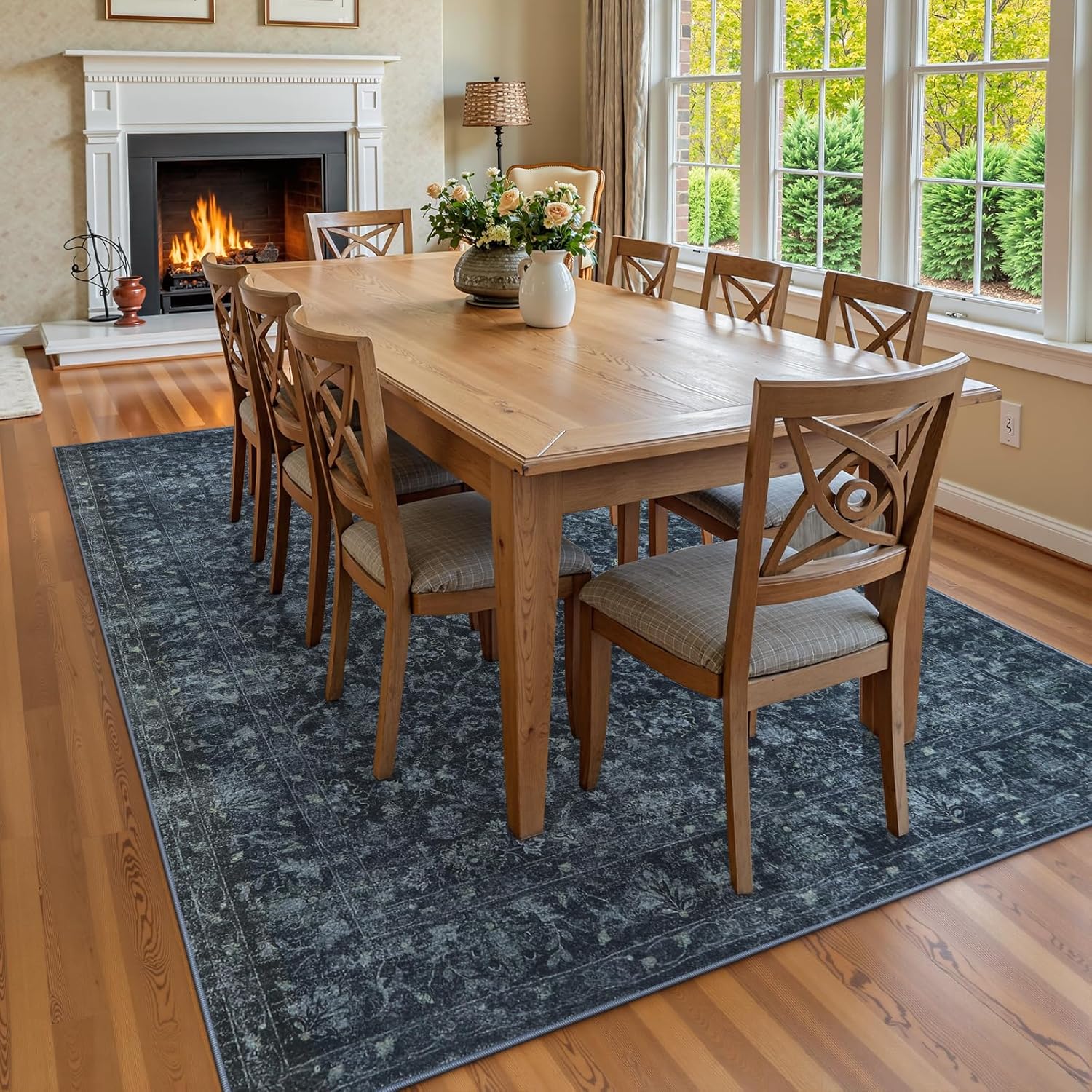 Vintage Navy Blue Rugs for Bedroom, Washable Moroccan 5x7 Rug for Living Room Non Slip, Stain Resistant Boho Dining Room Rug for High Traffic Area (5'x7', Blue)