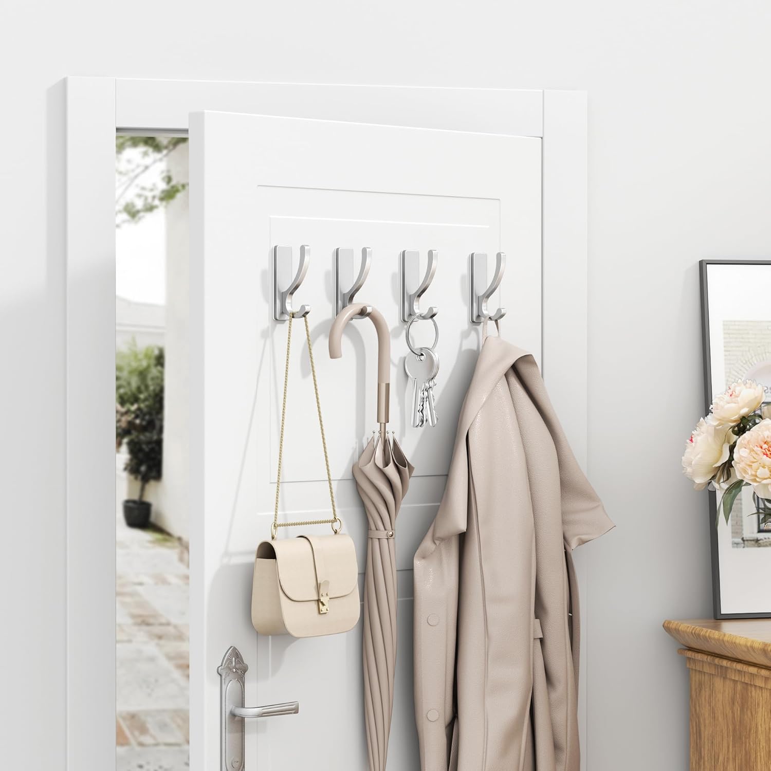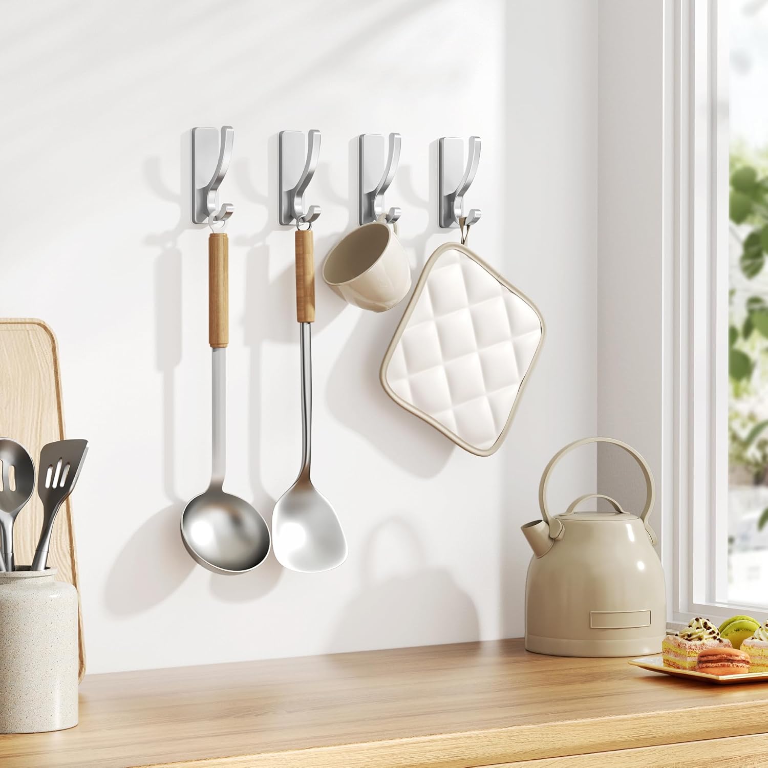 Adhesive Wall Hooks for Towels Coats - Stick On Hooks Hanging Heavy Duty (13lb), Metal Hook for Door, Bathroom, Dorm, Closet - Hanger for Purse, Bag, Robe,Backpack - No Damage to Wall - Silver 4 Pack