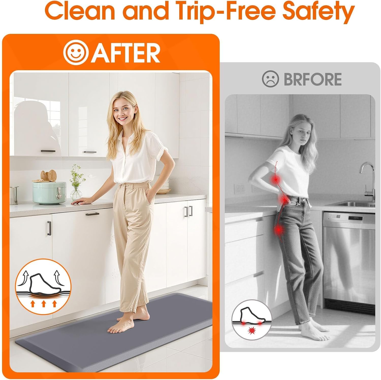 - 【Slip-Resistant Safety】 The surface and bottom are designed with different textures to prevent slipping and sliding. What’s more, the angled edges design help to prevent tripping. Always place the kitchen floor mats on a clean, dry floor for security