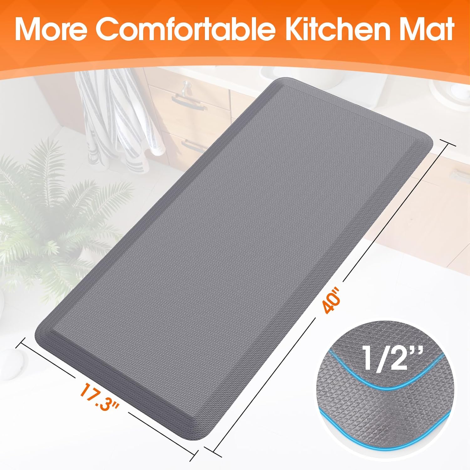 - 【Anti-Fatigue】 0.5 inch thick cushioned mat, provides cushioning for foot or joint discomfort caused by long periods standing. Ideal for long hours of standing while cooking, dish-washing, working, etc.