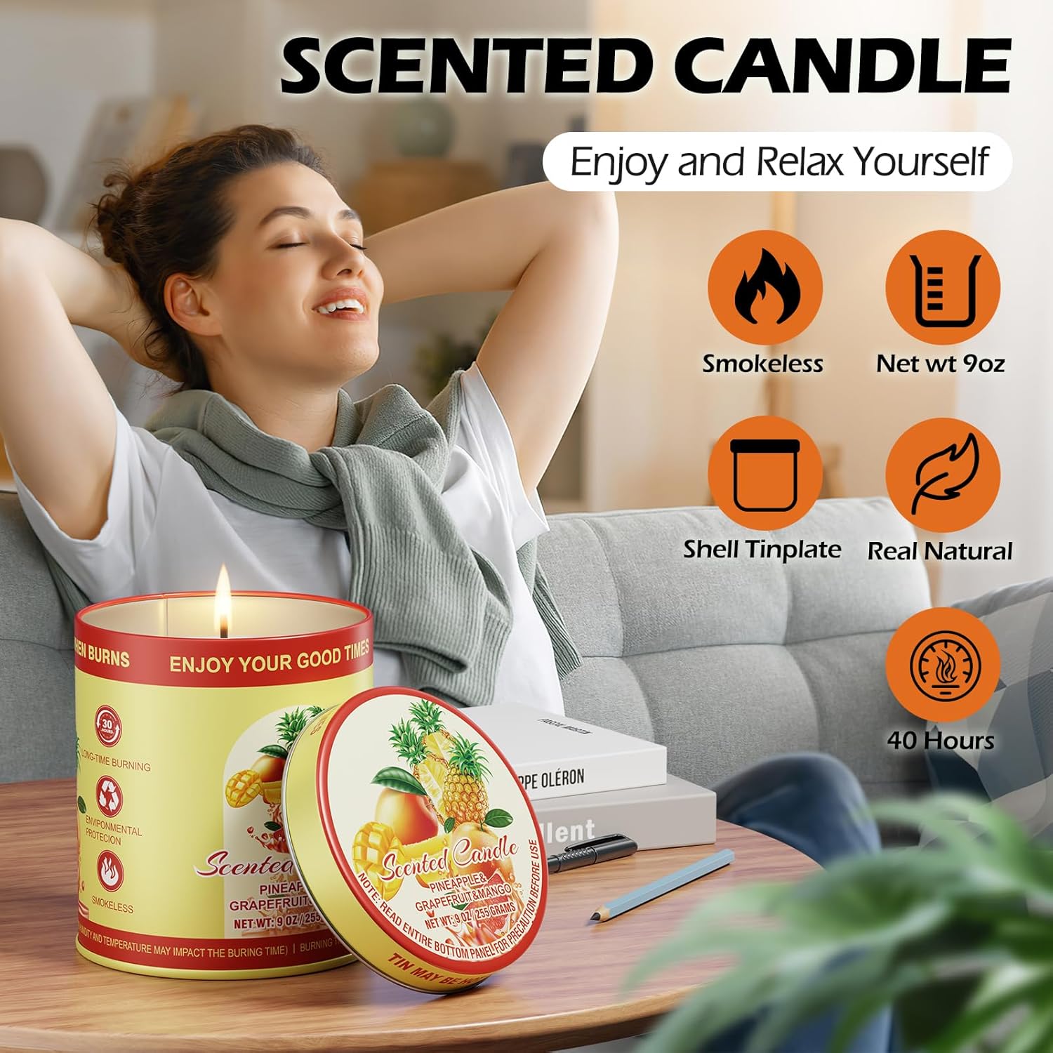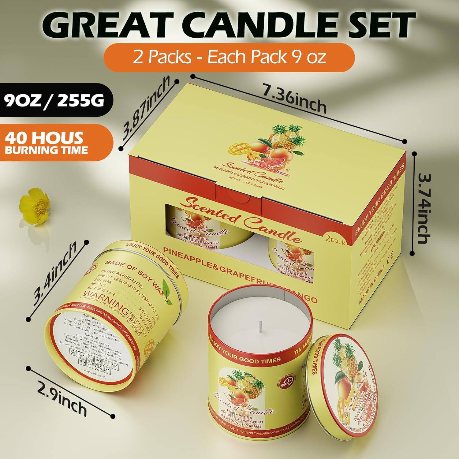 Pineapple Grapefruit Mango Scented Candles Set | 2 Pack 510g 8% Essential Oils 80H Burn | Smokeless Clean Burning Aromatherapy Tin Jar Candles for Home Relaxation, Yoga, Spa Gift for Men&Women