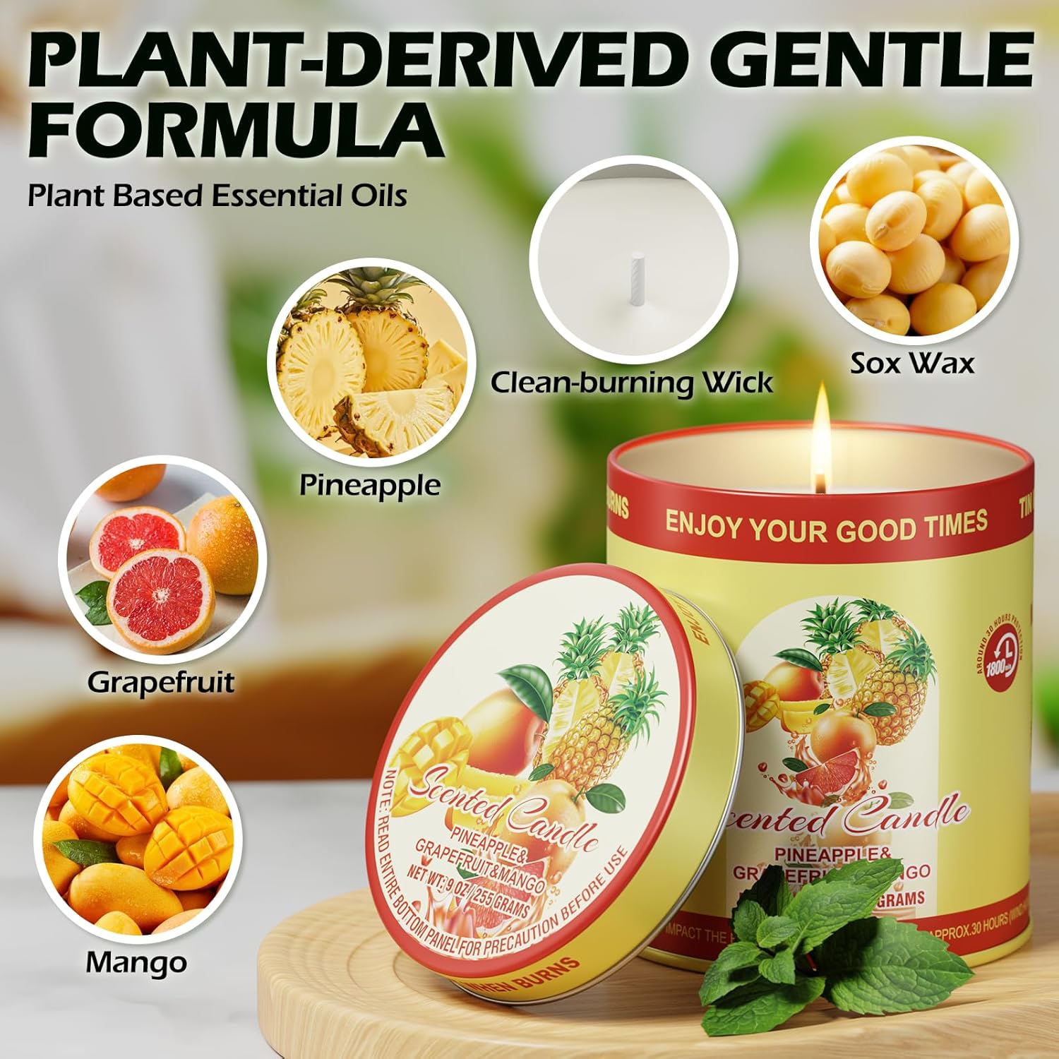- 【Tropical Fruit Fusion Scent】 Experience the vibrant blend of pineapple, grapefruit & mango in every burn. Infused with 8% premium essential oils, our mixed aroma candle delivers high-intensity fragrance to eliminate odors and create a refreshing atmosphere. Perfect for home aromatherapy candles to uplift your mood instantly.