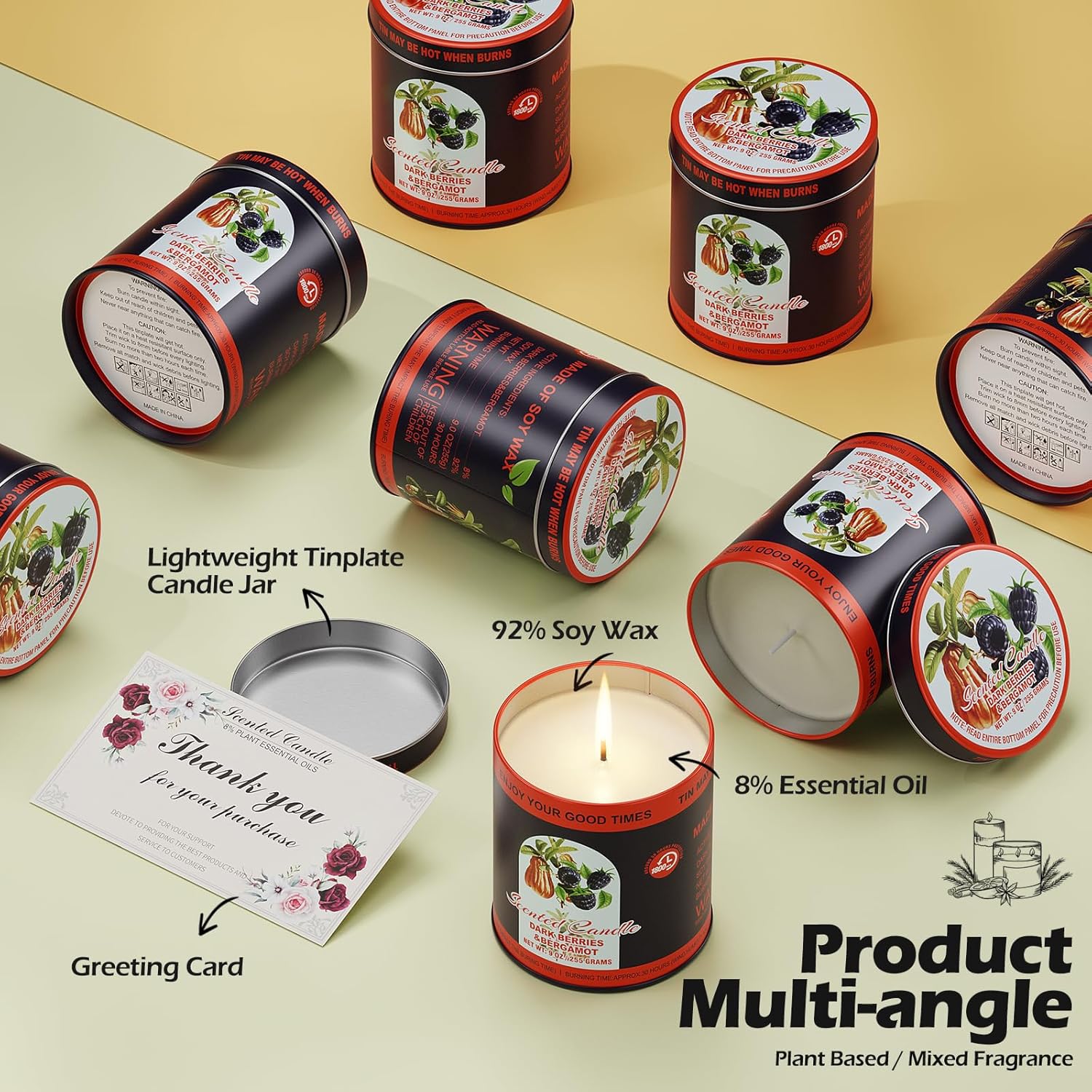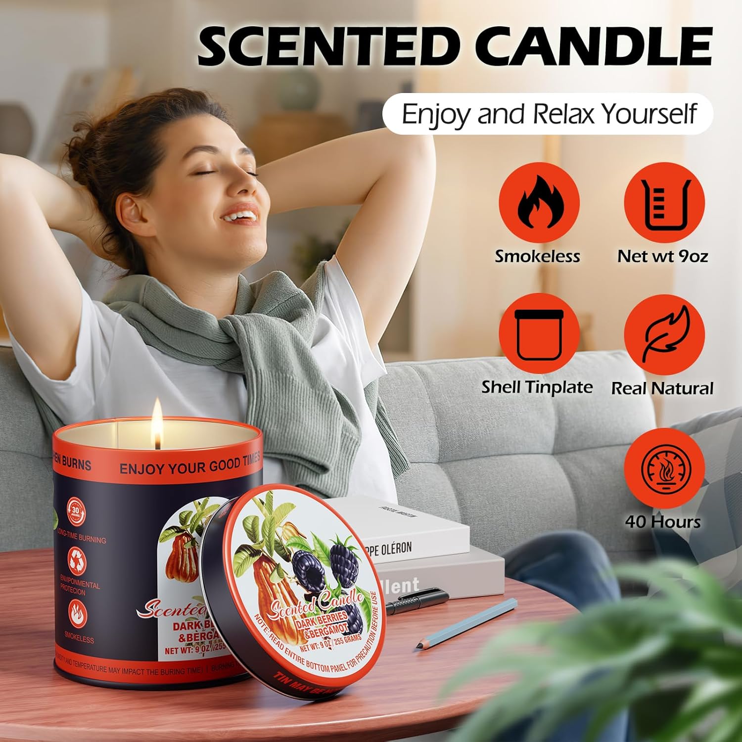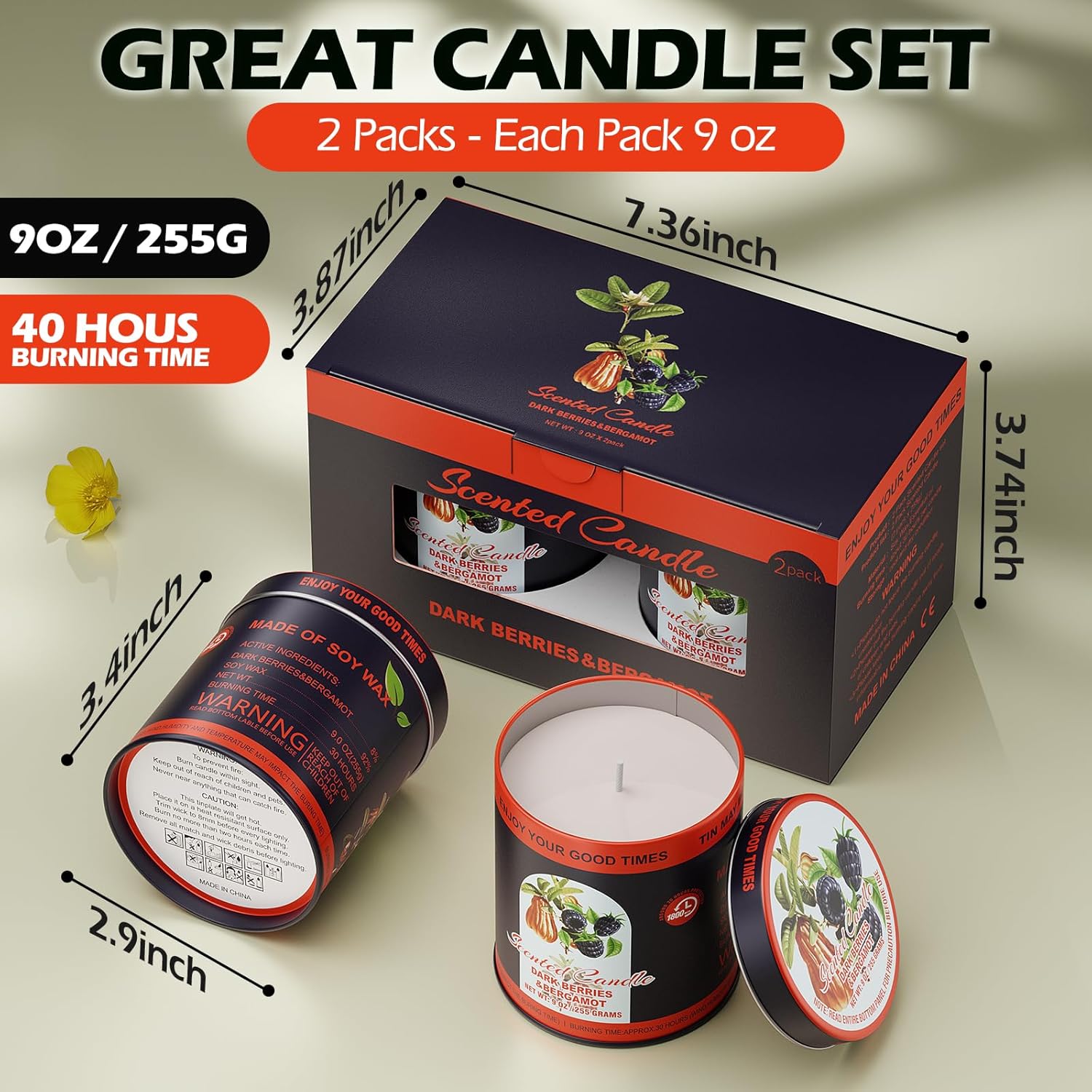 Premium Dark Berries & Bergamot Soy Wax Scented Candle Set - 9oz x 2 Pack, 80-Hour Burn Time, 8% Essential Oils for Aromatherapy Tin Jar Candle, Smoke-Free Relaxation,Yoga & Spa Gifts for Women/Men