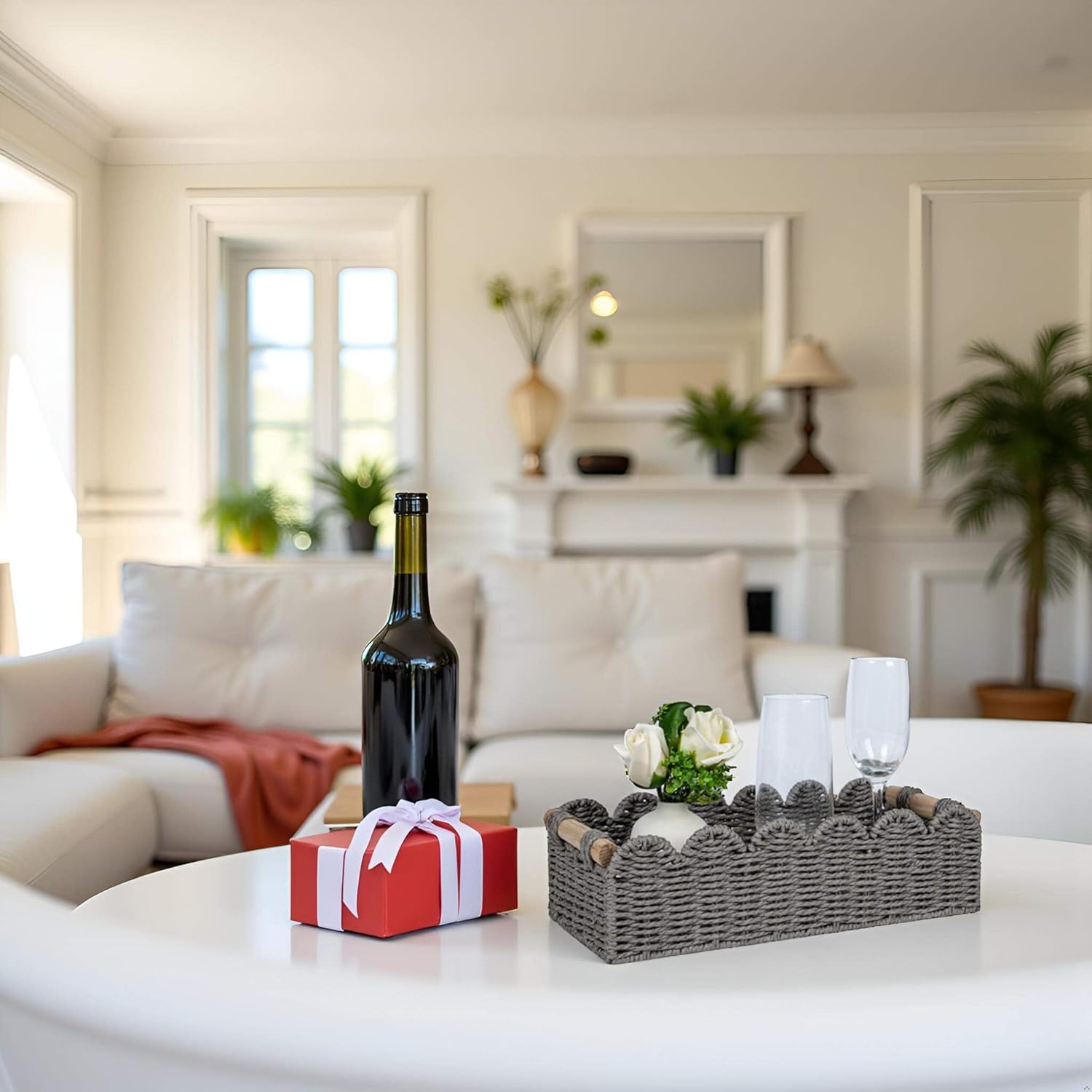 CubesLand Scalloped Edge Toilet Paper Storage Basket, Living Room Home Cozy Decor Basket, Paper Rope Small Baskets for Over Toilet Storage Shelf, End Table, Shelves, with 2 Wooden Handles, Grey